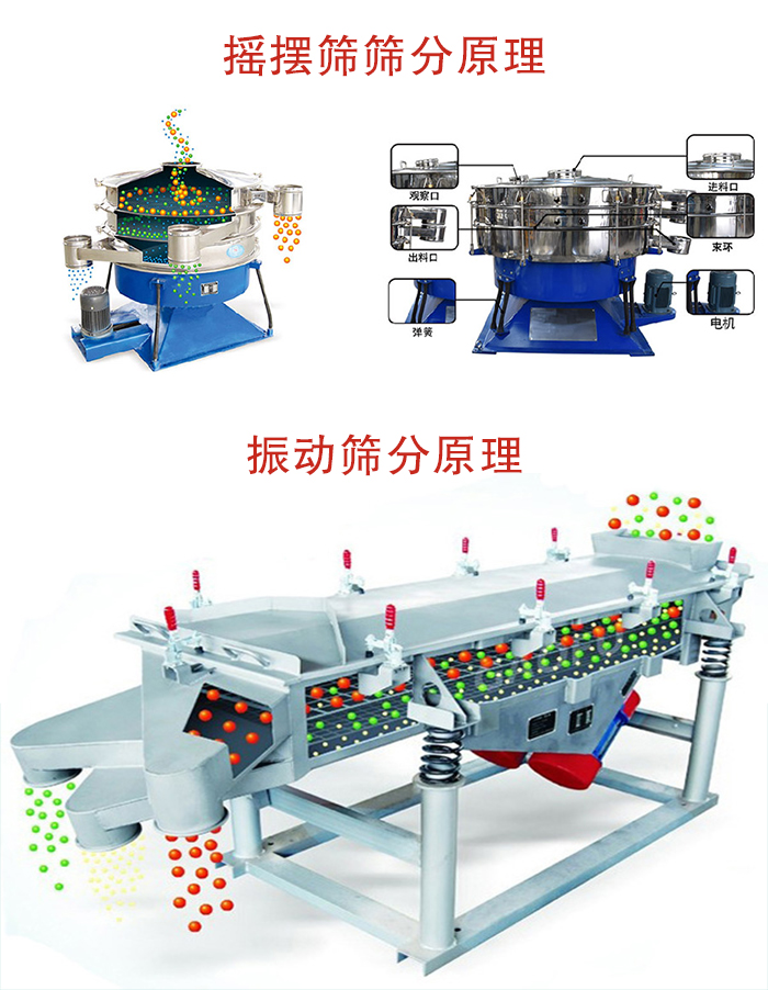 搖擺篩是模仿人工篩分,物料在篩面做非線性的三維運動,既有圓周運動,又有上拋弧運動,而振動篩是采用雙電機或直立式電機驅動,物料運動軌跡是一臺直線或者水平、傾斜、垂直的三次元運動。