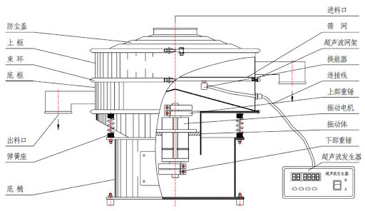 流通式超聲波篩由防塵蓋、進料斗、超聲波振動系統(tǒng)、篩網(wǎng)、出料口、減震底座、電機等組成。超聲波換能器均勻分布于篩網(wǎng)兩側(cè),通過高頻振動快速破除物料粘連,搭配耐磨不銹鋼篩網(wǎng),實現(xiàn)精細分級。中間層設(shè)導流板引導物料流通,底部減震底座采用橡膠減震墊,減少運行噪音與設(shè)備損耗。