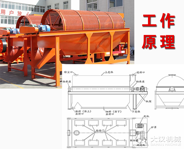滾筒篩篩沙機(jī)主要由電機(jī)、減速機(jī)、滾筒裝置、機(jī)架、密封蓋、進(jìn)料口、出料口等部分組成。滾筒裝置傾斜安裝于機(jī)架上。電動(dòng)機(jī)經(jīng)減速機(jī)與滾筒裝置通過聯(lián)軸器連接在一起,驅(qū)動(dòng)滾筒裝置繞其軸線轉(zhuǎn)動(dòng)。當(dāng)物料進(jìn)入滾筒裝置后,由于滾筒裝置的傾斜與轉(zhuǎn)動(dòng),使篩面上的物料翻轉(zhuǎn)與滾動(dòng),使合格物料(篩下產(chǎn)品)經(jīng)滾筒后端底部的出料口排出,不合格的物料(篩上產(chǎn)品)經(jīng)滾筒尾部的排料口排出。由于物料在滾筒內(nèi)的翻轉(zhuǎn)、滾動(dòng),使卡在篩孔中的物料可被彈出,防止篩孔堵塞。