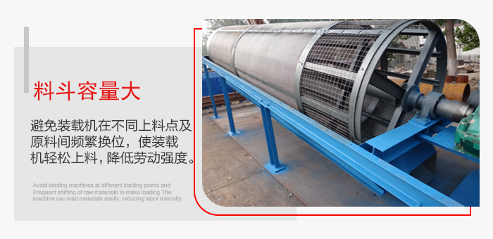 4.儲料斗容量大,使裝載機(jī)合理安排主設(shè)備(如攪拌站)與篩砂機(jī)的上料時(shí)間,避免裝載機(jī)在不同上料點(diǎn) 及原料間頻繁換位,使裝載機(jī)輕松上料,降低勞動(dòng)強(qiáng)度。